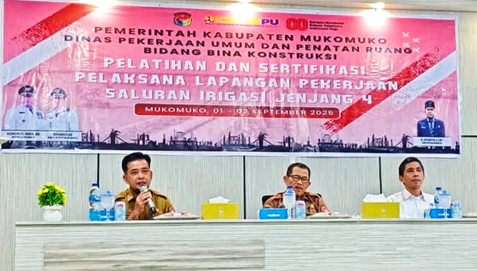 REAKSIMEDIA.COM | Mukomuko – Dinas PUPR Kabupaten Mukomuko, Melalui Bidang Bina Konstruksi menyelenggarakan kegiatan Pelatihan dan Sertifikasi Pelaksana Lapangan Pekerjaan Saluran Irigasi Jenjang IV (Empat) di Hotel Abyan Kabupaten Mukomuko, Senin (1/9/25).