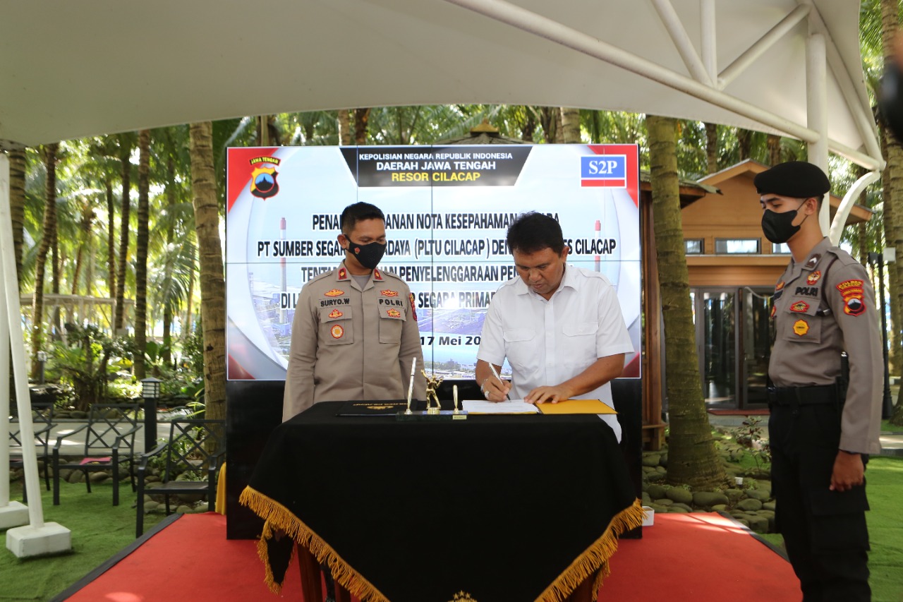 REAKSIMEDIA.COM | Cilacap – Wakapolres Cilacap Kompol Suryo Wibowo, S.I.K. menandatangani nota kesepahaman antara PT Sumber Segara Pri madya (PLTU CILACAP) dengan Polres Cilacap tentang Bantuan penyelenggaraan pengamanan di lingkungan PT. Sumber Segara Pri madya (PLTU Cilacap). Selasa (17 Mei 2022).