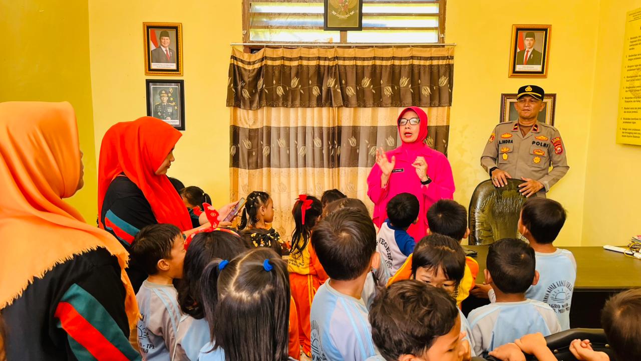 REAKSIMEDIA.COM | Mukomuko – Suasana ceria, riang dan gembira menyelimuti Mapolsek V Koto tatkala puluhan anak anak usia dini dari PAUD Terpadu Sekar Wangi, Amanda dan Lavender PT Agro Muko Talang Petai Estate berkunjung ke Mapolsek V Koto Polres Mukomuko Polda Bengkulu dalam rangka Studi Wisata (Pengenalan Lingkungan)