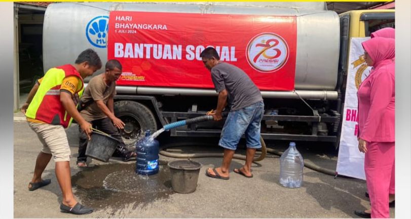 REAKSIMEDIA.COM | Polres Bogor – Kapolsek Ciampea, Kompol Suminto HP, SIP., MH., memimpin kegiatan pembagian air bersih kepada warga dan pedagang di Kp. Gedong, Desa Ciampea, Kabupaten Bogor pada hari Selasa, 25 Juni 2024. Kegiatan ini dilakukan sebagai bagian dari peringatan HUT Bhayangkara ke-78, bertujuan untuk membantu masyarakat yang kekurangan pasokan air bersih.