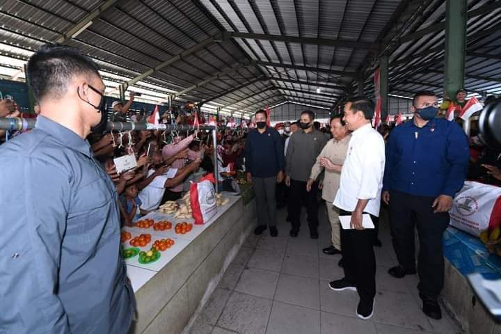Turut mendampingi Presiden dan Ibu Iriana dalam kunjungan ke pasar pagi ini yaitu Menteri Pertahanan Prabowo Subianto.