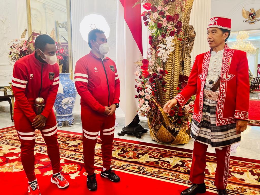 Tim Nasional hadir bersama pelatihnya Bima Sakti ke Istana Merdeka pukul 09.30 WIB dan langsung disambut Presiden Jokowi di ruang kredensial.