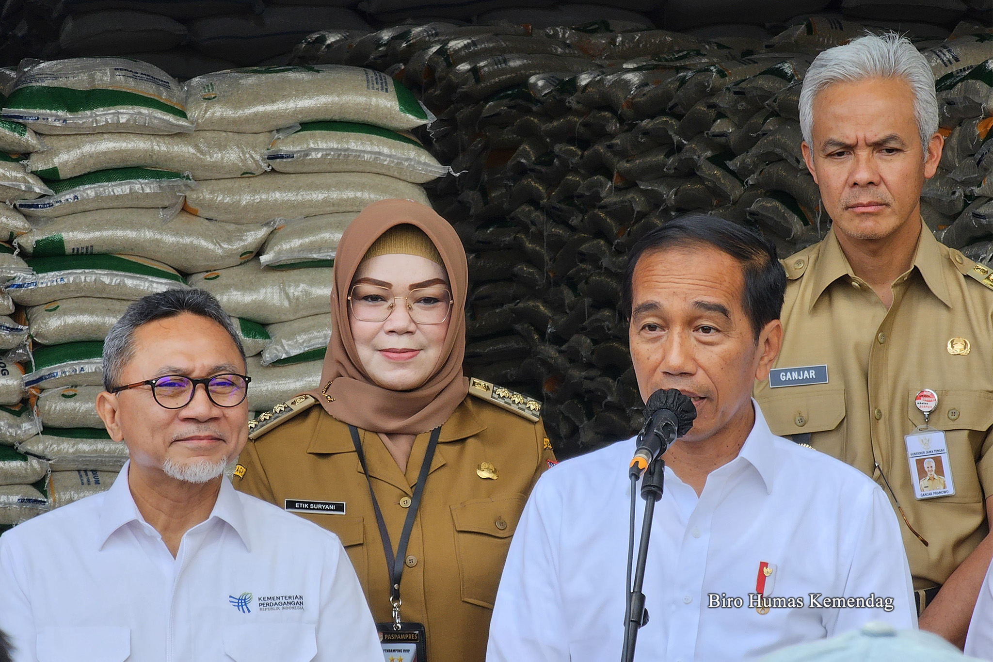 Turut hadir pada kesempatan tersebut Gubernur Jawa Tengah, Ganjar Pranowo; Kepala Badan Pangan Nasional, Arif Prasetyo Adi; Direktur Utama Perum Bulog, Budi Waseso; dan Bupati Sukoharjo, Etik Suryani.