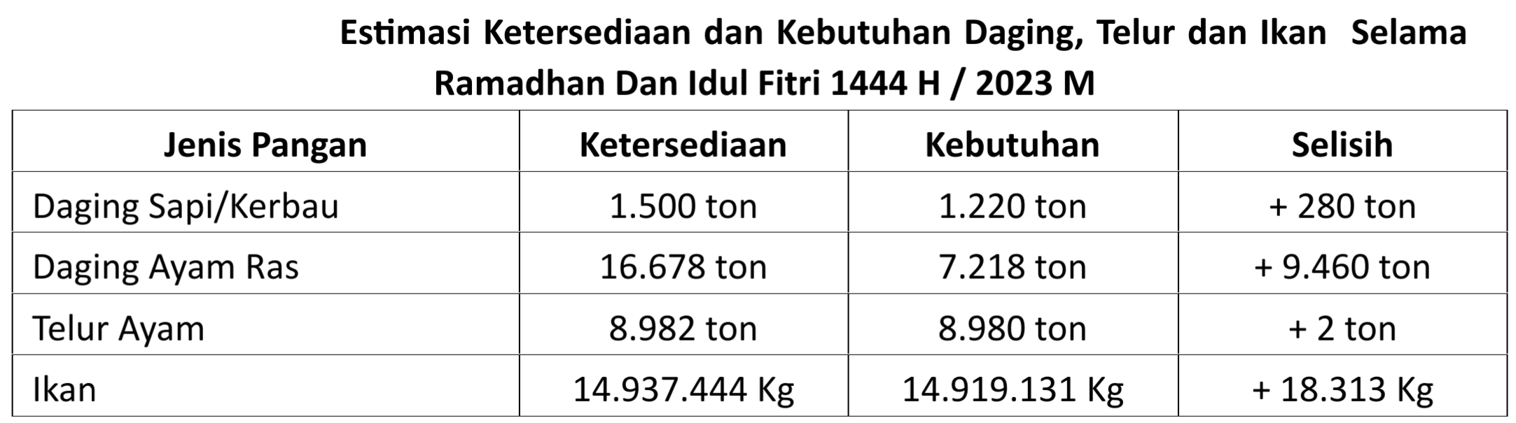 Besaran ketersediaan dan kebutuhan pangan asal hewan dan ikan untuk Idul Fitri 1444 H di Kabupaten Bogor secara terperinci dapat dilihat pada tabel berikut :