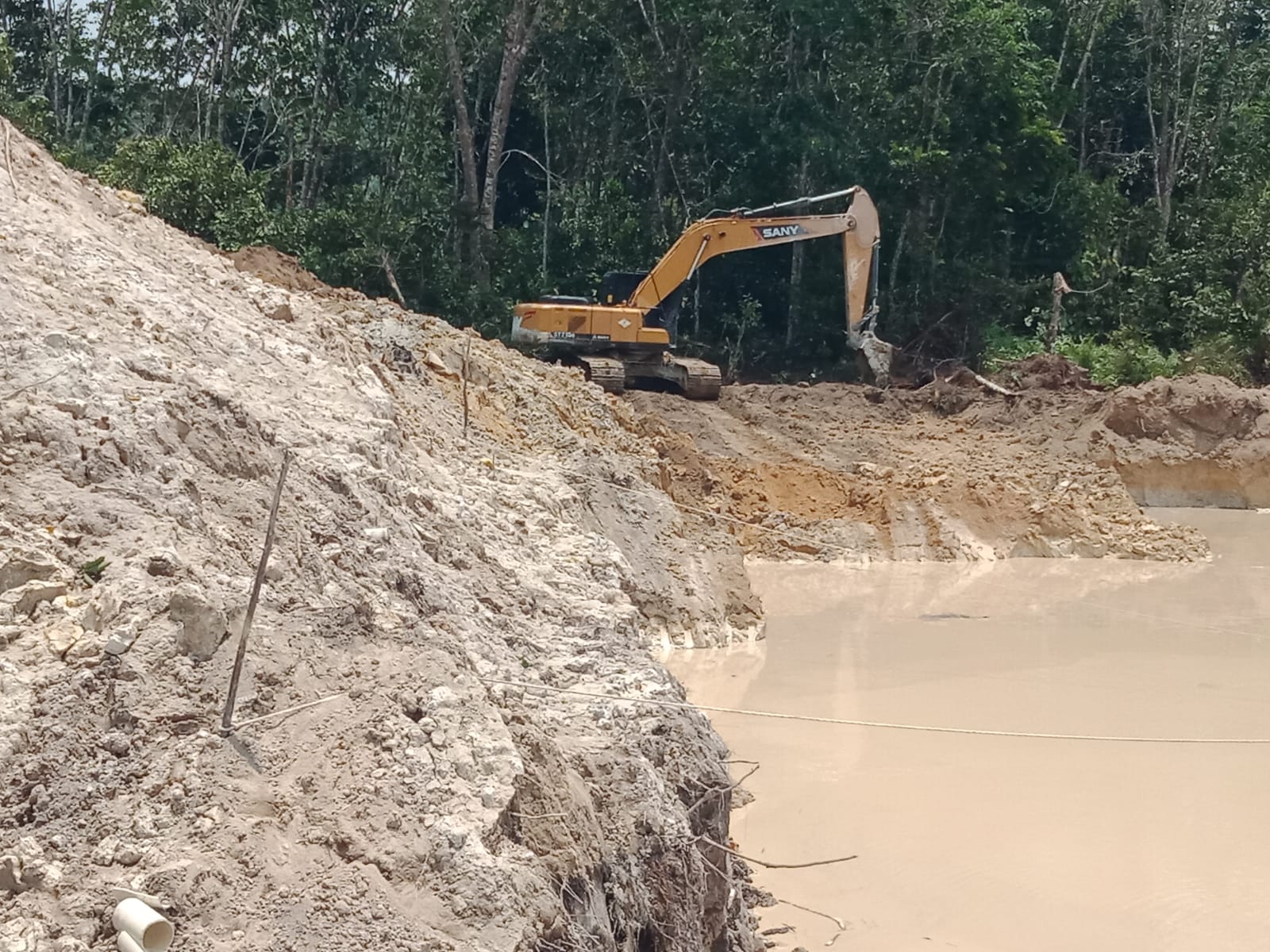 Hasil dari pantauan awak media di lapangan, terlihat dengan jelas satu unit alat berat jenis Excavator bermerek SANY sedang melakukan aktivitas pengerukan dan pengupasan yang diduga untuk pengerjaan tambang emas ilegal dimaksud.