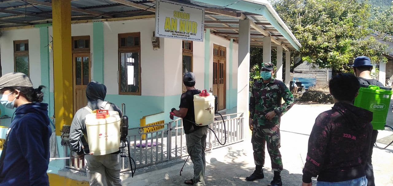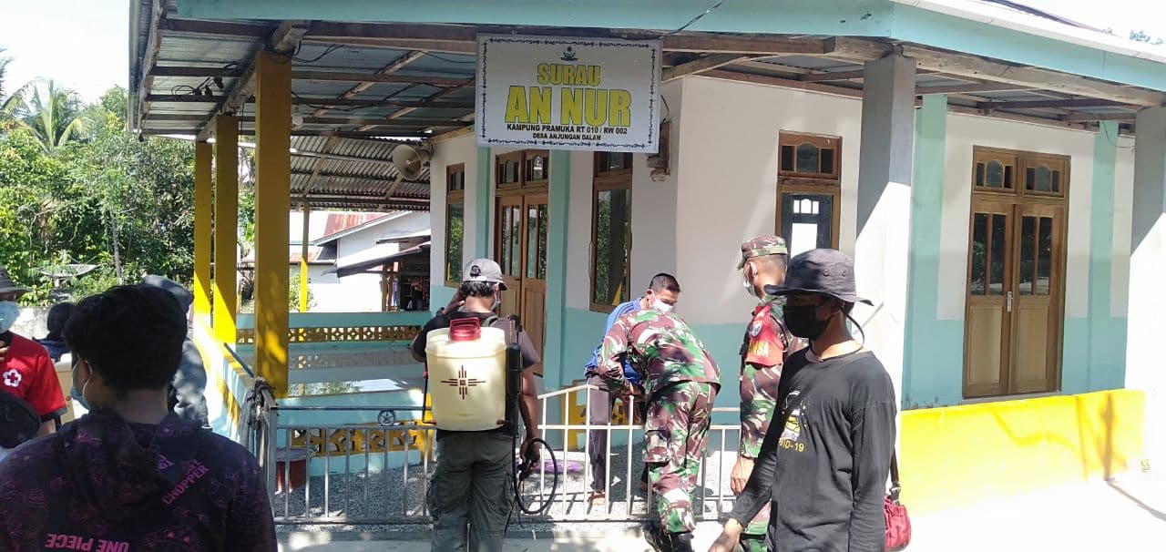 Berbekal pengetahuan tersebutlah Pelda Jemi bersama warga dan Satgas Covid untuk bersama sama melakukan penyemprotan disinfektant di Surau An Nur Kampung Pramuka RT 010 RW 002 Desa Anjungan Dalam.