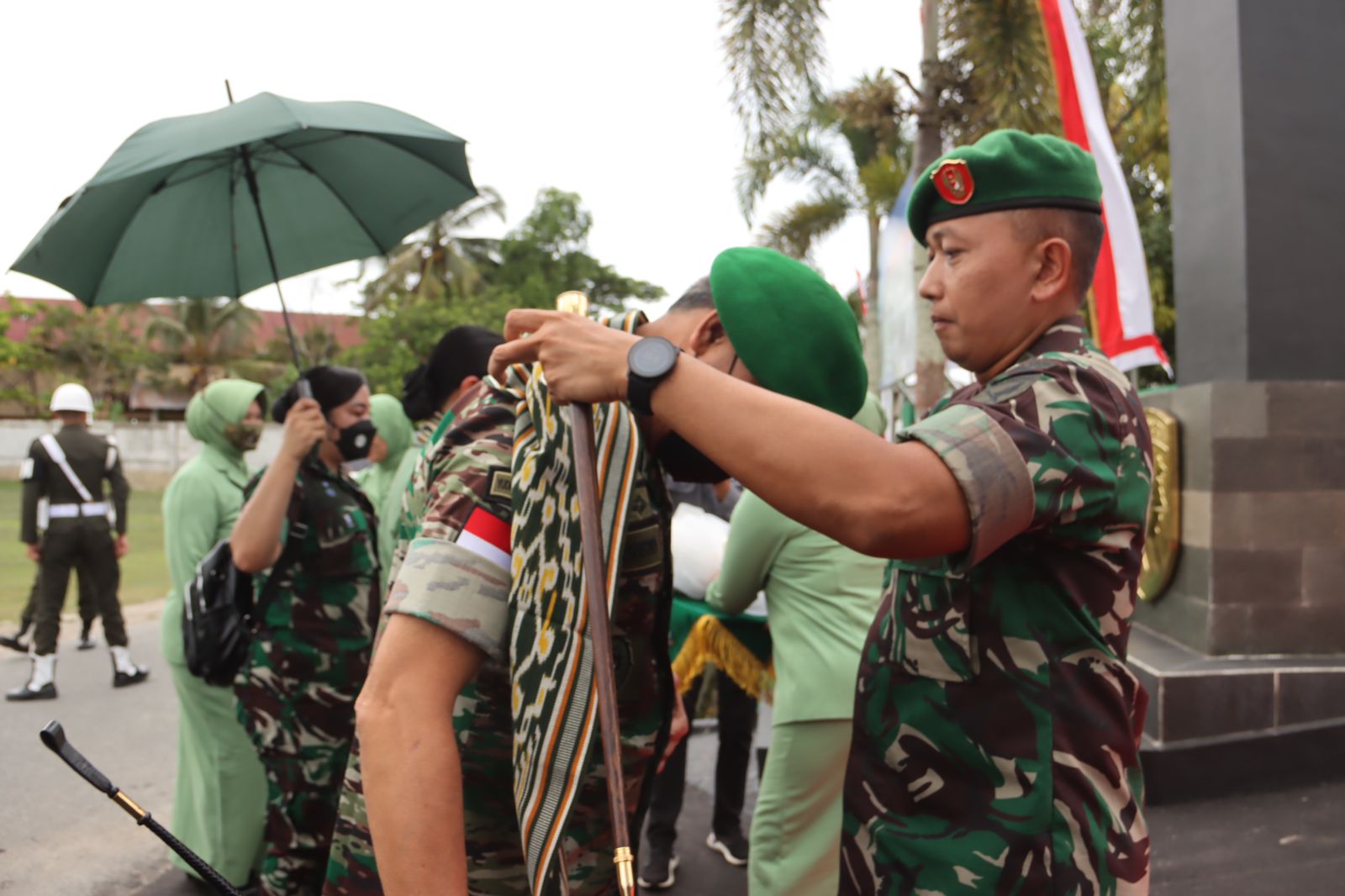 Pangdam XII/Tpr beserta rombongan disambut Dandim 1205/Stg, Letkol Inf Kukuh Suharwiyono, Ketua Persit KCK Cabang XLIX Kodim Sintang, Ny. Nia Kukuh Suharwiyono, Kasdim 1205/Stg, para Perwira Staf dan Danramil, para Prajurit serta Persit.
