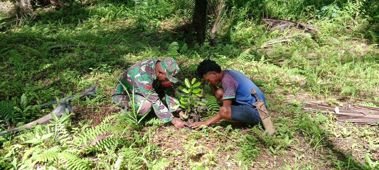 REAKSIMEDIA.COM | Buru Selatan – Selain sasaran fisik berupa pembangunan infrastruktur, Satgas TMMD Kodim 1506/Namlea juga mengerjakan sasaran non fisik yakni penanaman 10.000 bibit pohon keras. Setelah pembukaan TMMD Satuan Tugas Kodim 1506/Namlea secara serentak, di tempat terpisah telah menanam bibit pohon keras seperti Trambsesi serta Mahoni dan pohon berbuah seperti Rambutan dan Durian sebanyak 350 pohon. Bibit di tanam secara tersebar dibeberapa kecamatan, yakni Kecamatan Namrole 50 pohon, Waesama 250 pohon dan Fenafafan sebanyak 100 pohon.