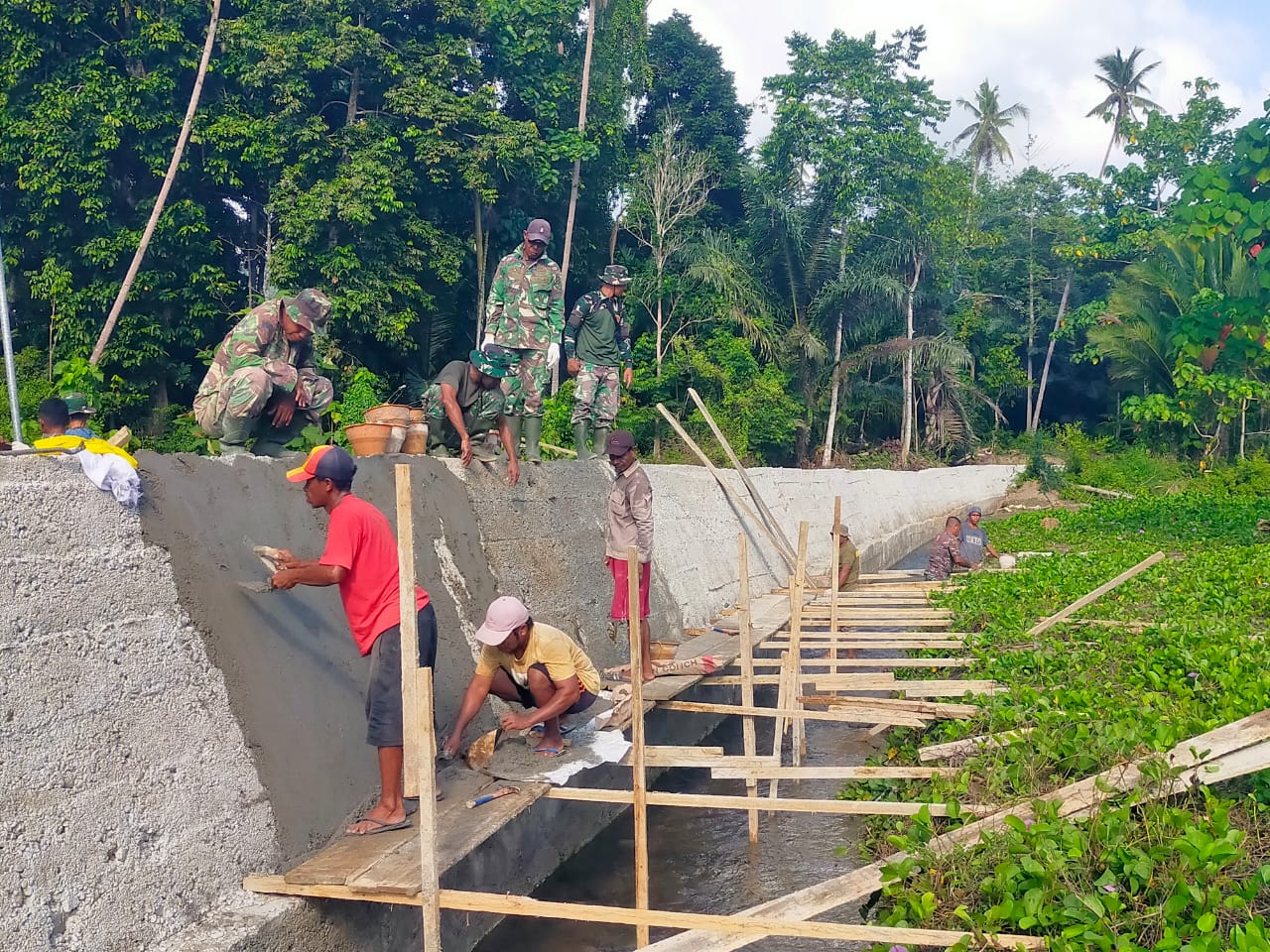 REAKSIMEDIA.COM | Sanana – Meski TMMD Reguler ke-123 Kodim 1510/Sula di Desa Pastina, Kec. Sanana, Kab. Kepulauan Sula, Provinsi Maluku Utara, tinggal 5 hari lagi, Talud kejar target harus segera diselesaikan proses plester dan pengacian. Hal ini dilaksanakan untuk memperkuat struktur talud itu sendiri. Beberapa personel TNI dan warga tampak sedang melaksanakan proses pengacian.