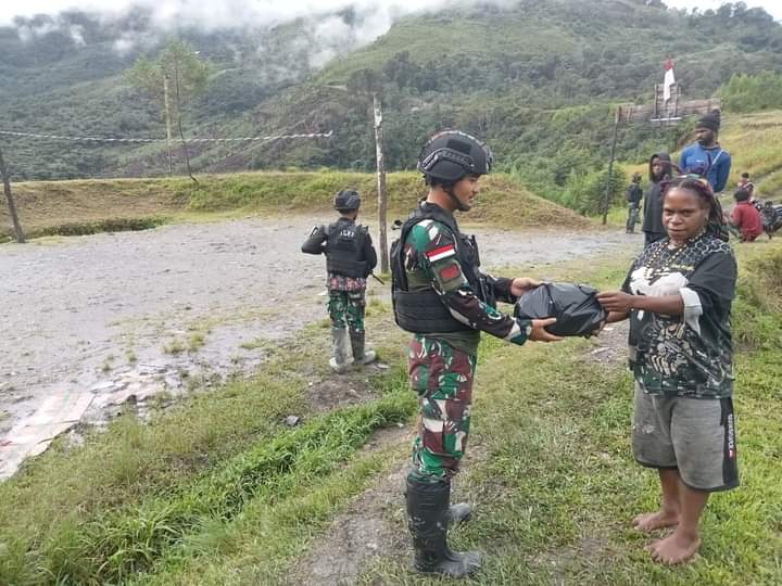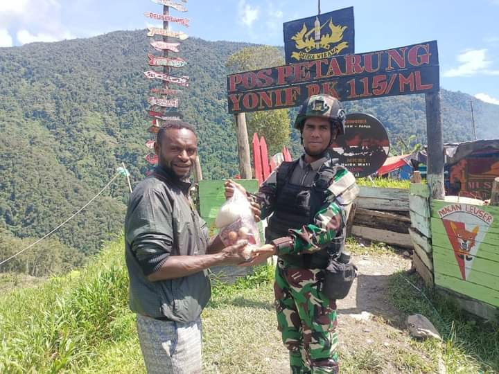 REAKSIMEDIA.COM | Puncak Jaya – Satgas RK 115/ML yang bertugas di Pos TNI Tinolok, Puncak Jaya Papua, memberikan bantuan sembako kepada masyarakat Kampung Tinolok, diserahkan oleh Danpos Tinolok Lettu Inf Ferri Nurgian Mi’raj bersama anggotanya, hari Jum’at (5/5/2023).