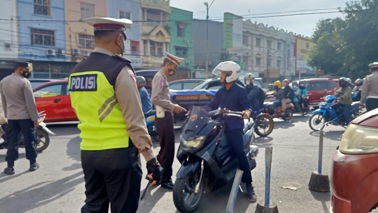 Di tengah suasana arus lalu lintas yang padat, para personil selain melaksanakan kegiatan operasi yustisi dalam hal penggunaan masker juga melakukan pengaturan lalu lintas.
