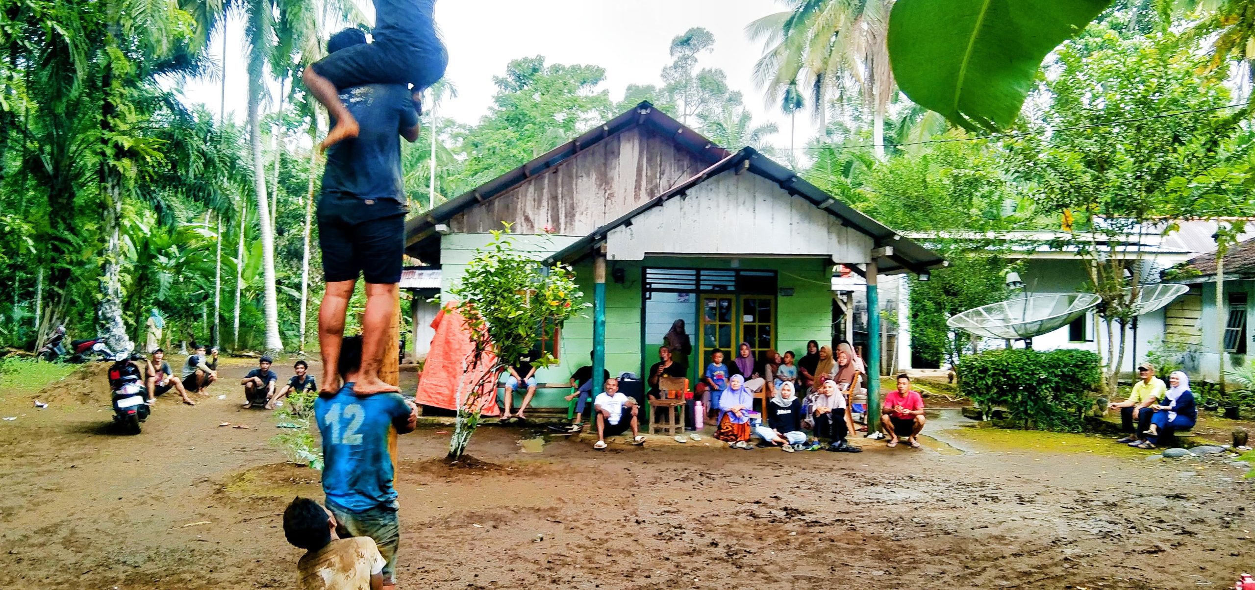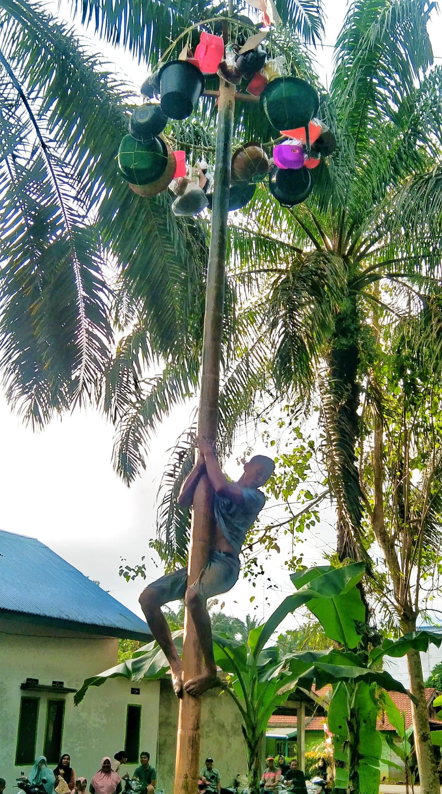 Tampak semangat peserta lomba panjat pinang berusaha untuk meraih hadiah walau ditengah rintik hujan yang datang dan pergi dengan keriuhan dari para penonton memberi semangat kepada peserta yang mengikuti lomba.