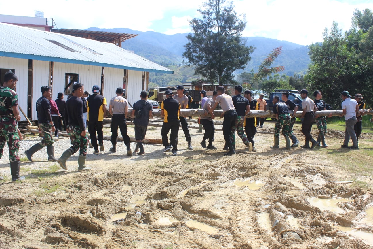 REAKSIMEDIA.COM | Lanny Jaya – Personel Pos Kotis Satgas Yonif Mekanis 203/AK dan anggota Koramil Tiom serta Polres Lanny Jaya melaksanakan karya bhakti bersama dengan para jemaat Gereja GKI Betel Tiom dan juga masyarakat pendatang di Gereja GKI Betel Tiom, Distrik Tiom, Kab. Lanny Jaya, Papua, Minggu (12/03/2023).