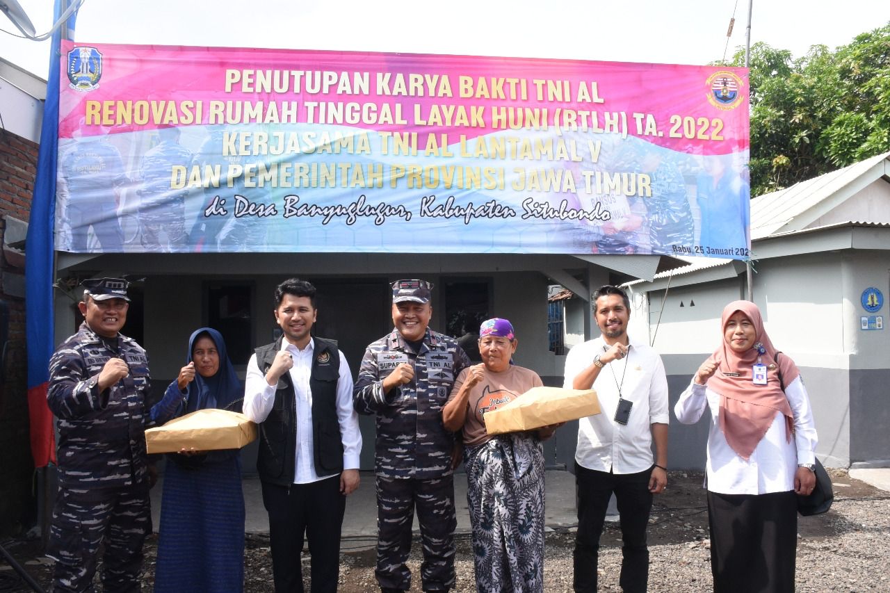 Pada pertengahan bulan September 2022 sampai dengan pertengahan bulan Desember 2022 lalu sebanyak 225 rumah disediakan bagi masyarakat di beberapa daerah yakni 53 rumah di Kabupaten Sumenep, 47 rumah di Kabupaten Bangkalan, 15 rumah di Kabupaten Gresik, 30 rumah di Kabupaten Lamongan, 30 rumah di Kabupaten Probolinggo dan 50 rumah di Kabupaten Situbondo. Penyelesaian karya bhakti tersebut ditandai dengan penutupan dan penyerahan kepada masyarakat oleh Komandan Pangkalan Utama TNI Angkatan Laut (Lantamal) V Surabaya Laksamana Pertama TNI Supardi bersama dengan Wakil Gubernur Jawa Timur Emil Elestianto Dardak bertempat di Desa Banyuglugur, Kabupaten Situbondo, Jawa Timur, Rabu (25/01) kemarin.
