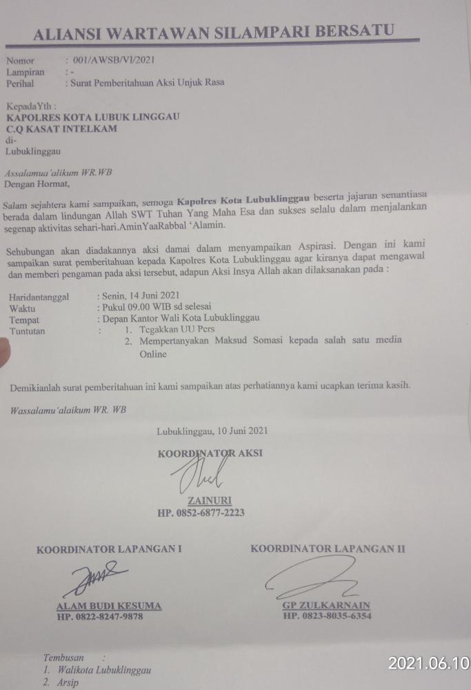 Surat Pemberitahuan Aksi tetsebut ditujuhkan kepada Kapolres Cq. Kasat Intelkam. Dalam surat pemberitahuan aksi akan dilakukan pada hari Senin 14 Juni 2021. Dengan tuntutan yang pertama tegakkan Undang-undang Pers, yang kedua mempertanyakan tujuan somasi yang disampaikan kepada salah satu media online.