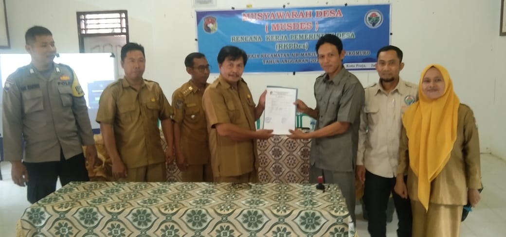 “Dengan musyawarah desa diharapkan memudahkan desa untuk menentukan skala prioritas pembangunan di desanya. Juga diharapkan samasama mengawal program yang sudah diputuskan bersama, sehingga bisa membantu mempercepat pembangunan di desanya dan percepatan pembangunan di Kabupaten Mukomuko,” pungkas Camat Air Manjuto Sugiyanto Spd