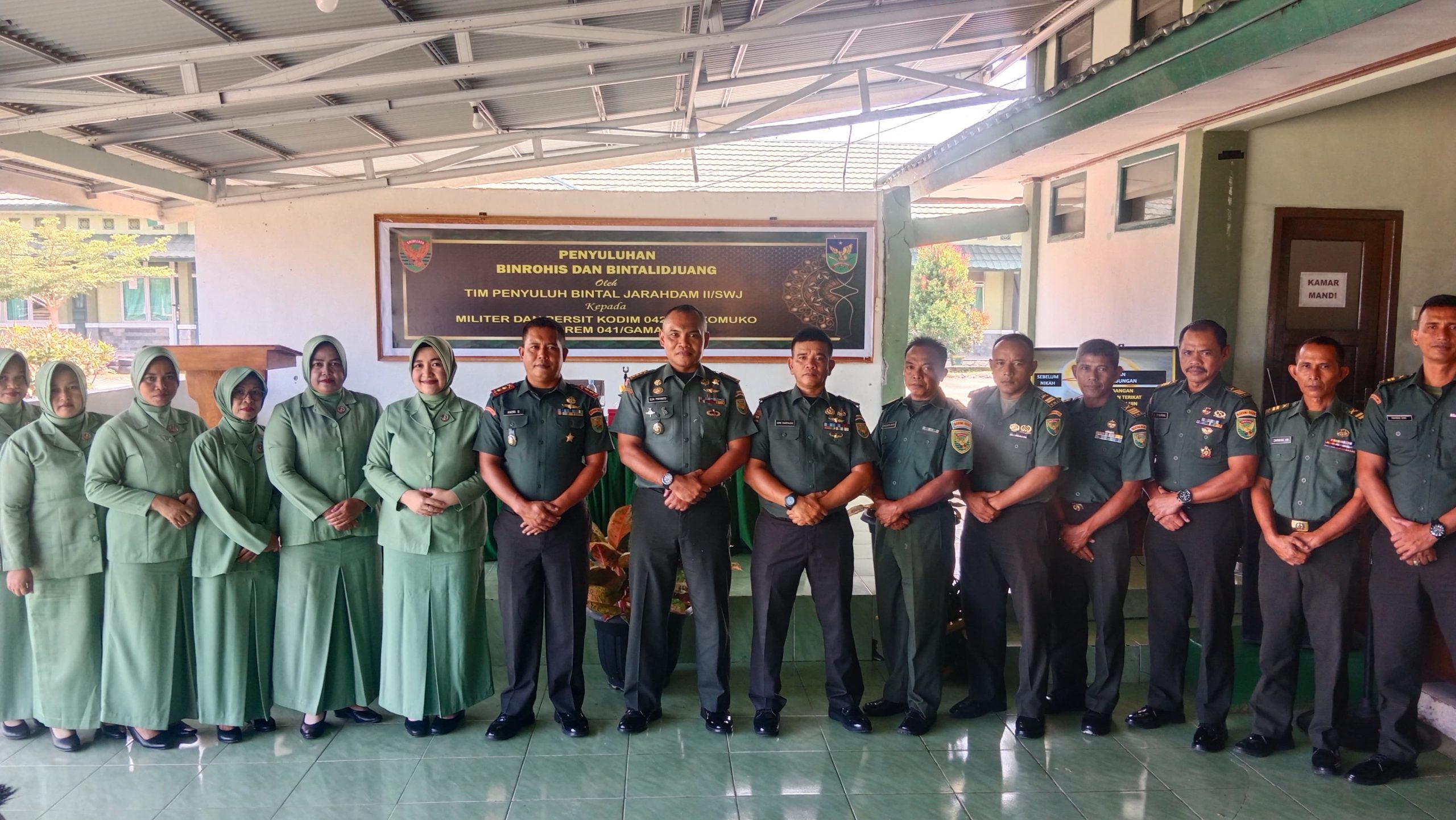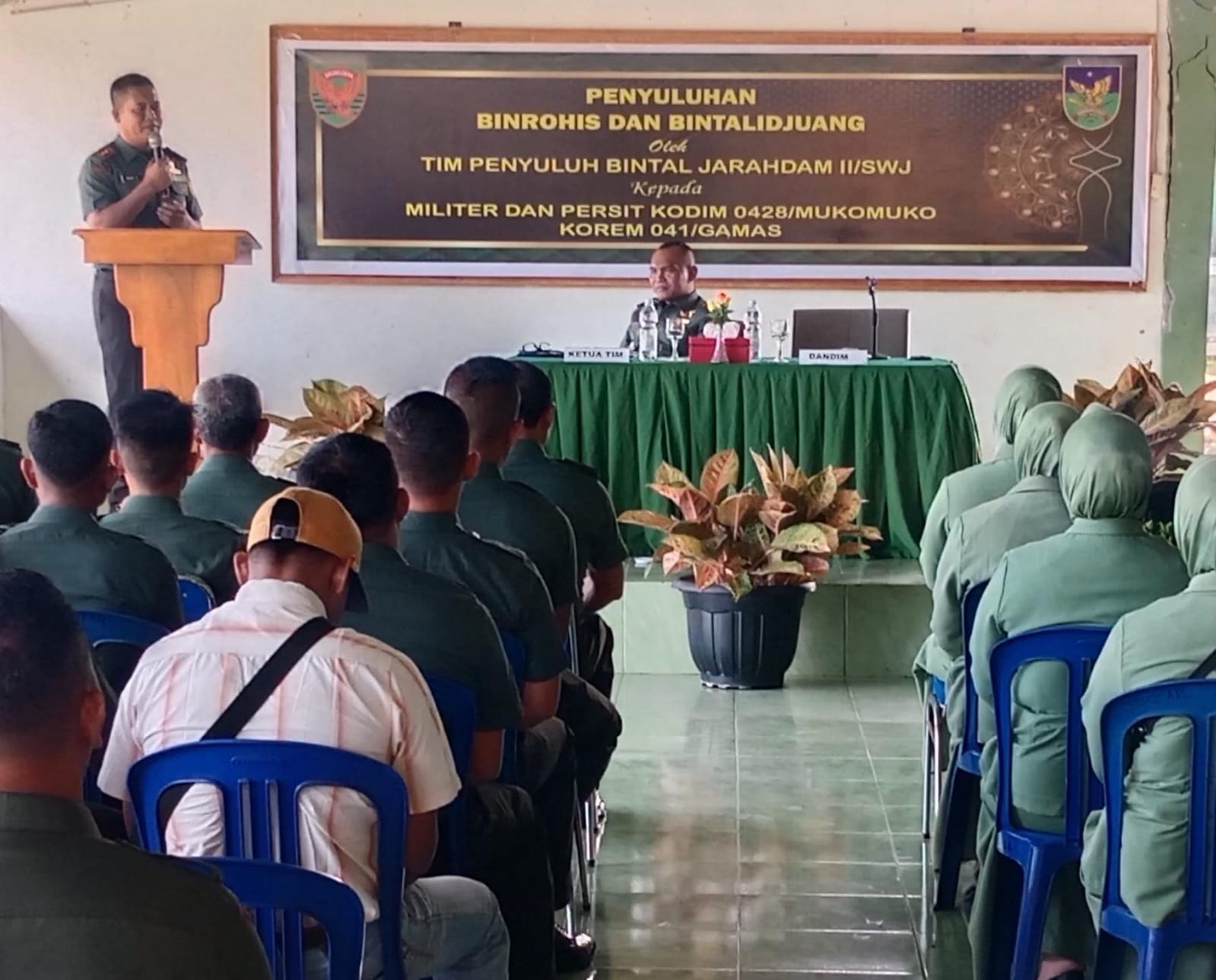 Korem 041/Gamas melalui Bintaldam II/Swj melaksanakan penyuluhan Pembinaan Rohani Islam (Binrohis) dan Pembinaan Mental Ideologi Perjuangan (Bintalidjuang) TA 2023 kepada seluruh Prajurit Kodim 0428/ beserta Persit KCK LD II Kodim Mukomuko, acara yang digelar di aula Makodim 0428/Mukomuko, Kamis (7/12/23).
