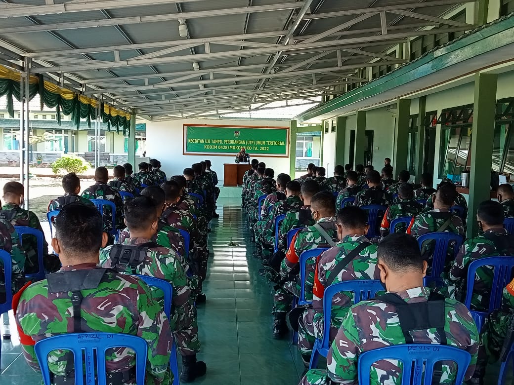 REAKSIMEDIA.COM | Mukomuko, Bengkulu – Kegiatan Uji Tampil Perorangan (UTP) Teritorial Kodim 0428/Mukomuko Tahun 2022, bertujuan untuk meningkatkan keterampilan perorangan sesuai dengan kepangkatan dimana Uji Tampil Perorangan (UTP) Umum Teritorial. adalah upaya satuan untuk memelihara dan meningkatkan profesionalitas prajurit dalam penguasaan serta keterampilannya pada jabatan masing-masing yang diemban, agar .para prajurit memiliki kecakapan dalam melaksanakan tugas, baik secara perorangan maupun dalam hubungan kelompok.