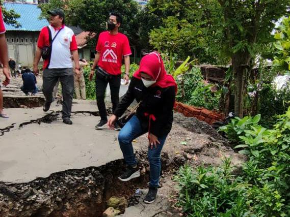 “Medannya luar biasa, kita lihat tadi, ruas-ruas jalan mulai mengalami keretakan dan kemiringan yang cukup parah. Ini sangat-sangat membahayakan warga,” ungkap Dewi Aryani saat tiba di lokasi terparah.
