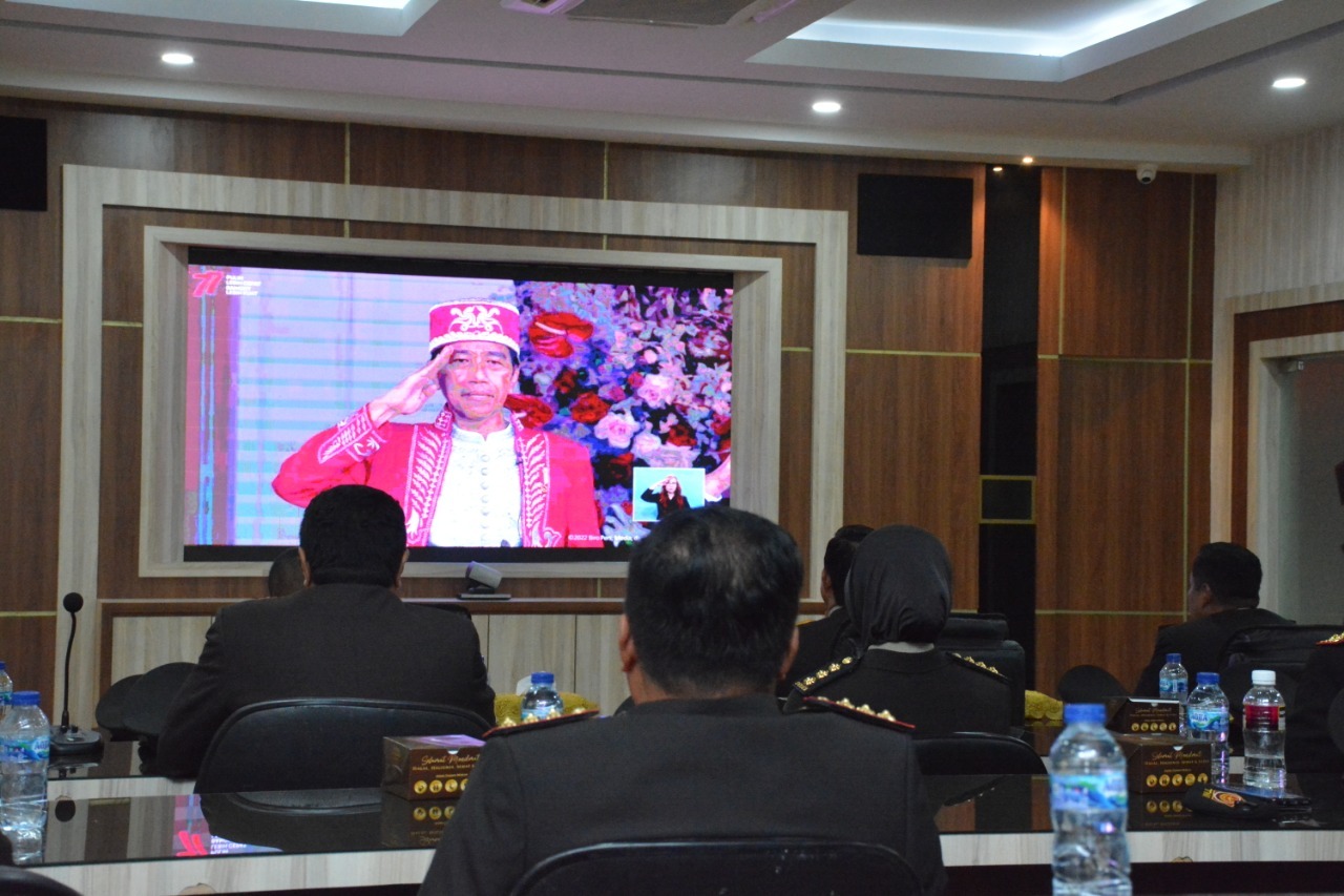 REAKSIMEDIA.COM | Batam – Bertempat di Ruang Vicon Polda Kepri, Wakapolda Kepri Brigjen Pol. Drs. Rudi Pranoto didampingi Irwasda Polda Kepri dan Pejabat Utama Polda Kepri mengikuti video conference Upacara Peringatan Detik-Detik Proklamasi HUT Kemerdekaan Republik Indonesia ke-77 di Istana Negara. Rabu (17/8/2022).