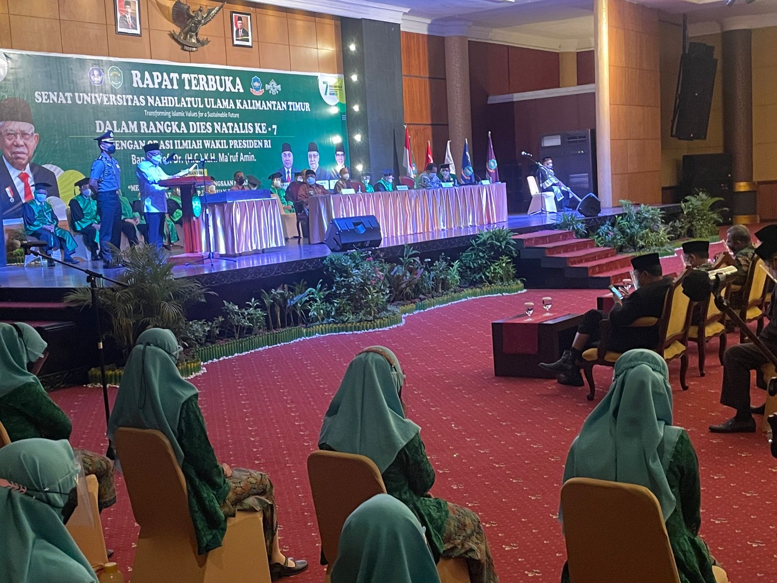 “Perguruan Tinggi sebagai tahap akhir pendidikan formal seyogianya dapat membekali mahasiswa untuk senantiasa berpikir kritis dalam menyikapi arus informasi, dengan berpegang teguh pada akidah, akhlak, dan ilmu pengetahuan,” tutur Wakil Presiden (Wapres) K. H. Ma’ruf Amin saat memberikan orasi ilmiah dalam rangka Dies Natalis ke-7 Universitas Nahdlatul Ulama (UNU) Kalimantan Timur di Grand Ballroom Hotel Bumi Senyiur Samarinda, Selasa (2/11/2021).