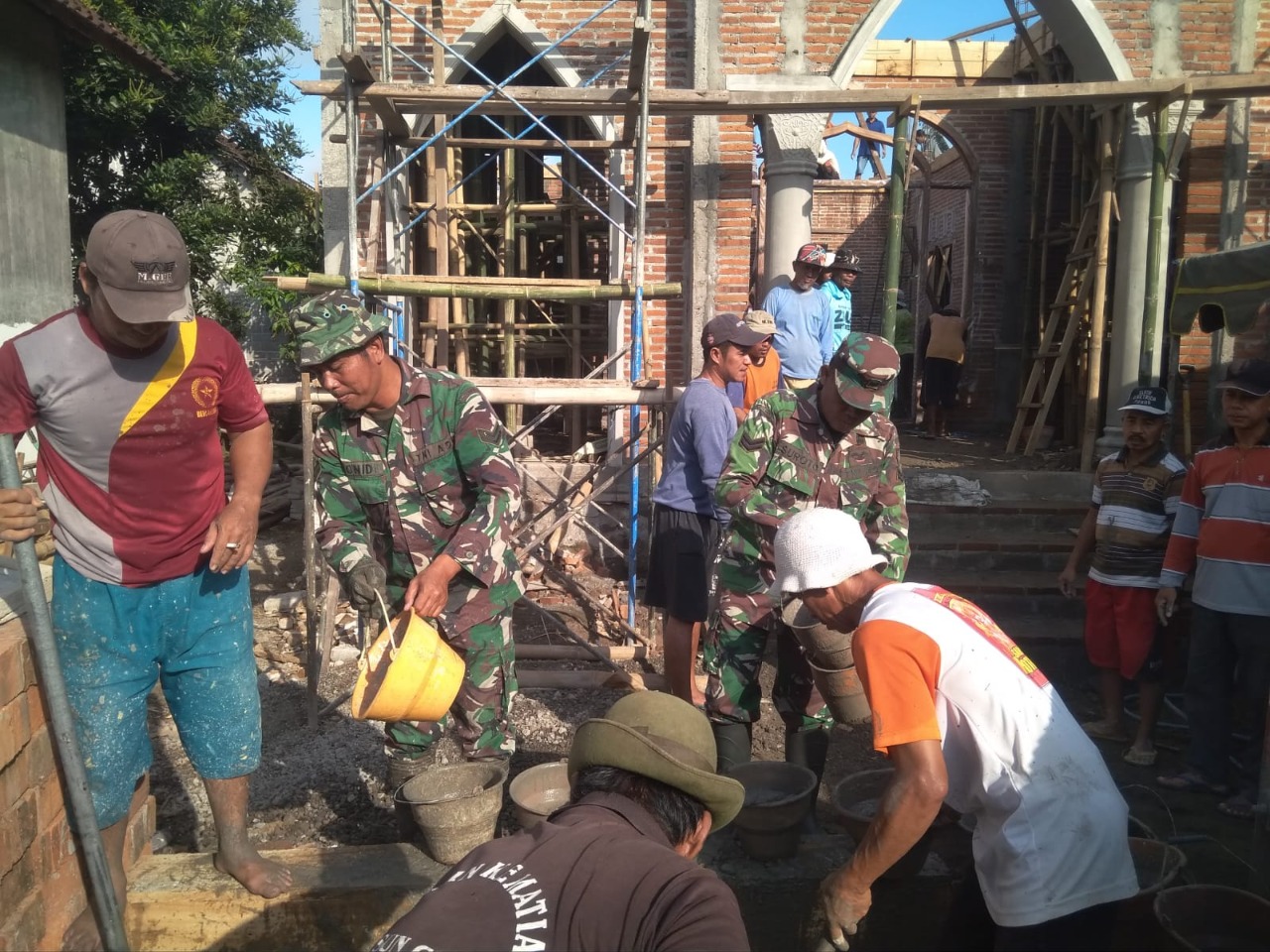 REAKSIMEDIA.COM | Blitar – Dengan penuh semangat anggota Koramil Tipe B 0808/04 Sanankulon Kodim 0808/Blitar bersama warga masyarakat, saling bahu membahu dan bergotong royong untuk melaksanakan kegiatan kerja bakti pengecoran Mushola Raudhatul Jannah, di Dusun Cerme Desa Kalipucung Kec. Sanankulon Kab. Blitar, Minggu (25/9/2022 ).