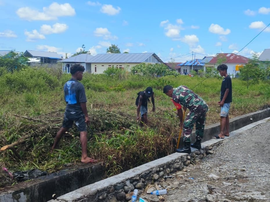 REAKSIMEDIA.COM | Timika – Babinsa Koramil 1710-02/Timika Sertu Rusdin Wali mengajak warga di desa binaannya melaksanakan karya bakti membersihkan saluran air di Kampung Mawokauw, Distrik Wania, Kabupaten Mimika, Jumat (05/01/2024).
