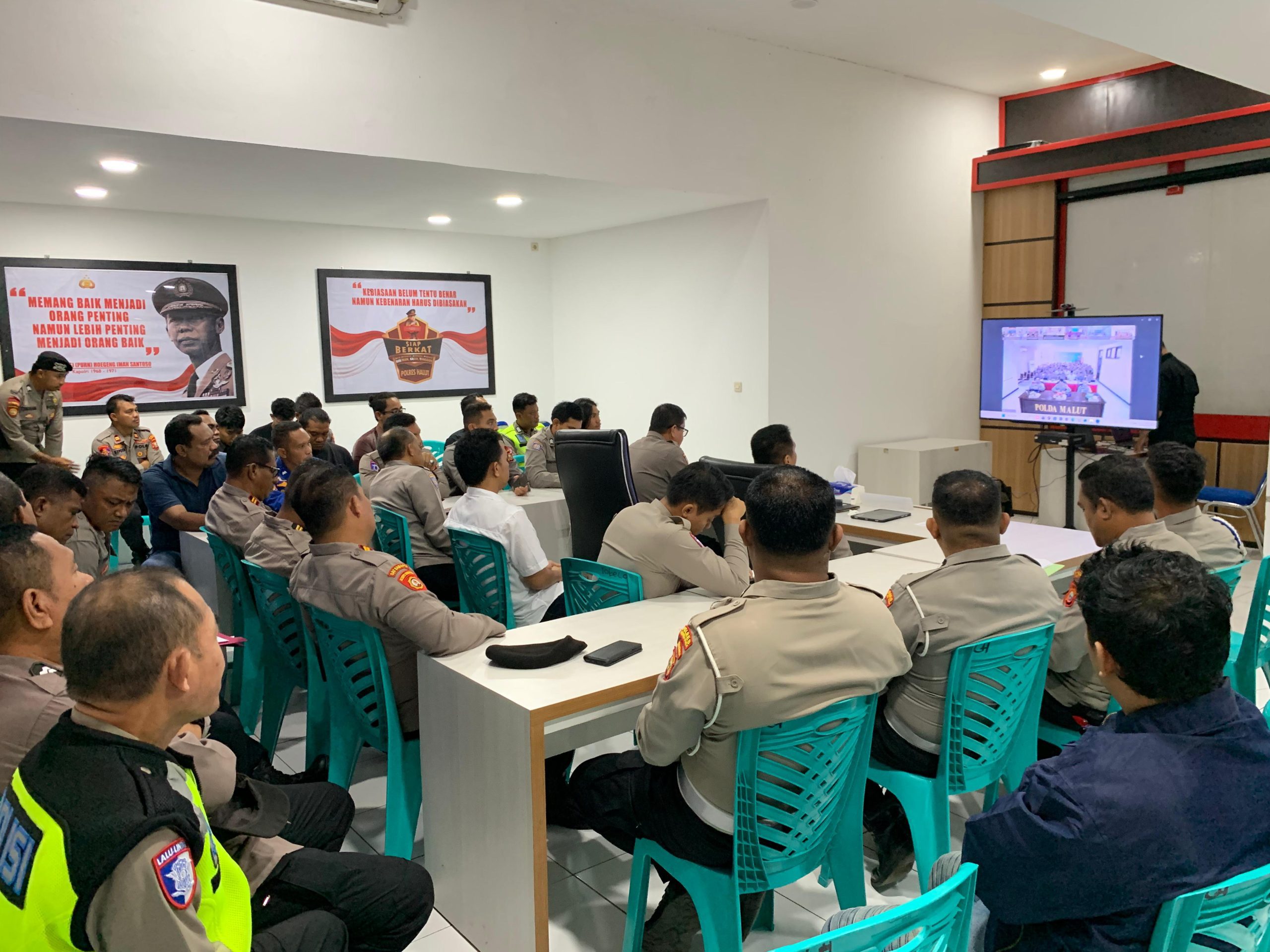 Kegiatan yang berlangsung khidmat di ruang Zoom Meeting Polres Halut ini dipimpin langsung oleh Kapolres Halmahera Utara, AKBP Erlichson Pasaribu, S.H., S.I.K. Turut hadir mendampingi jajaran pejabat utama mulai dari Kabag Ops, Kasi Was, Kasi Propam, hingga para Kapolsek jajaran. Kehadiran formasi lengkap ini menjadi simbol kuat bahwa setiap lini di Polres Halut bergerak serentak demi kenyamanan warga.