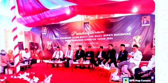 ” Terhadap sukses kepemimpinan Kabupaten Mukomuko, kami juga berharap bagaimana kita bisa memberikan satu pembelajaran berpolitik dengan baik kepada masyarakat dengan berkampanye yang baik, dan terakhir kami ucapkan terimakasih kepada seluruh relawan, partai pendukung, Tokoh masyarakat yang telah hadir, yang dengan ikhlas mengantarkan kami untuk maju dan mengikuti Pemilukada Kabupaten Mukomuko serta apresiasi kepada insan Pers yang hadir pada hari ini,” tutup Huda yang disambut yel yel “Hura” oleh pendukungnya.